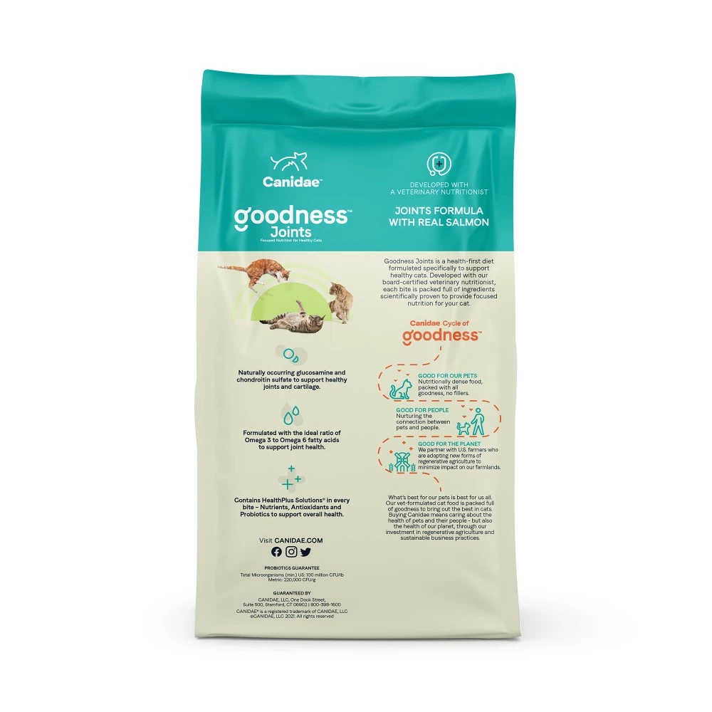Canidae Goodness for Joints Formula with Real Salmon Dry Cat Food is formulated to meet the nutritional levels established by the AAFCO Cat Food Nutrient Profiles for maintenance. Canidae Goodness Dry Cat Food Formulas is a health-first line formulated specifically to support healthy adult cats. Developed in partnership with a board-certified veterinary nutritionist, each bite is packed full of ingredients scientifically proven to provide focused nutrition for your cat. Our Joints Formula with Real Salmon has real salmon as the first ingredient and is rich in natural glucosamine and chondroitin sulfate to support healthy joints and cartilage. Made in the USA with domestic and globally sourced ingredients. High quality, wholesome ingredients means you’re giving your pet the goodness they deserve with no corn, wheat, soy or other fillers. Canidae was founded in 1996 with the belief that pet food needed to be better. Better for pets and better for us all. We nourish pets and planet in every bowl, through our use of wholesome, responsibly sourced proteins, and our investment in regenerative farming, sustainable operations, and eco-friendly packaging, setting a new standard for the pet food industry. Everything we do results in a better product. A bowl full of goodness.