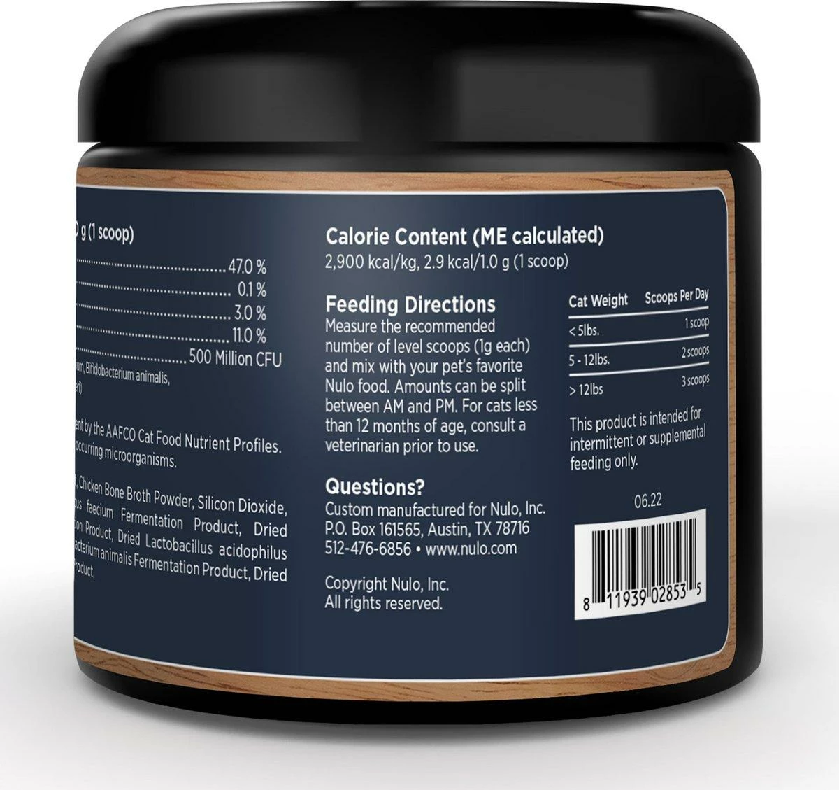 Brewers Dried Yeast, Chicken Bone Broth Powder, Silicon Dioxide, Natural Flavor, Dried Enterococcus faecium Fermentation Product, Dried Lactobacillus plantarum Fermentation Product, Dried Lactobacillus acidophilus Fermentation Product, Dried Bifidobacterium animalis Fermentation Product, Dried Lactobacillus reuteri Fermentation Product.