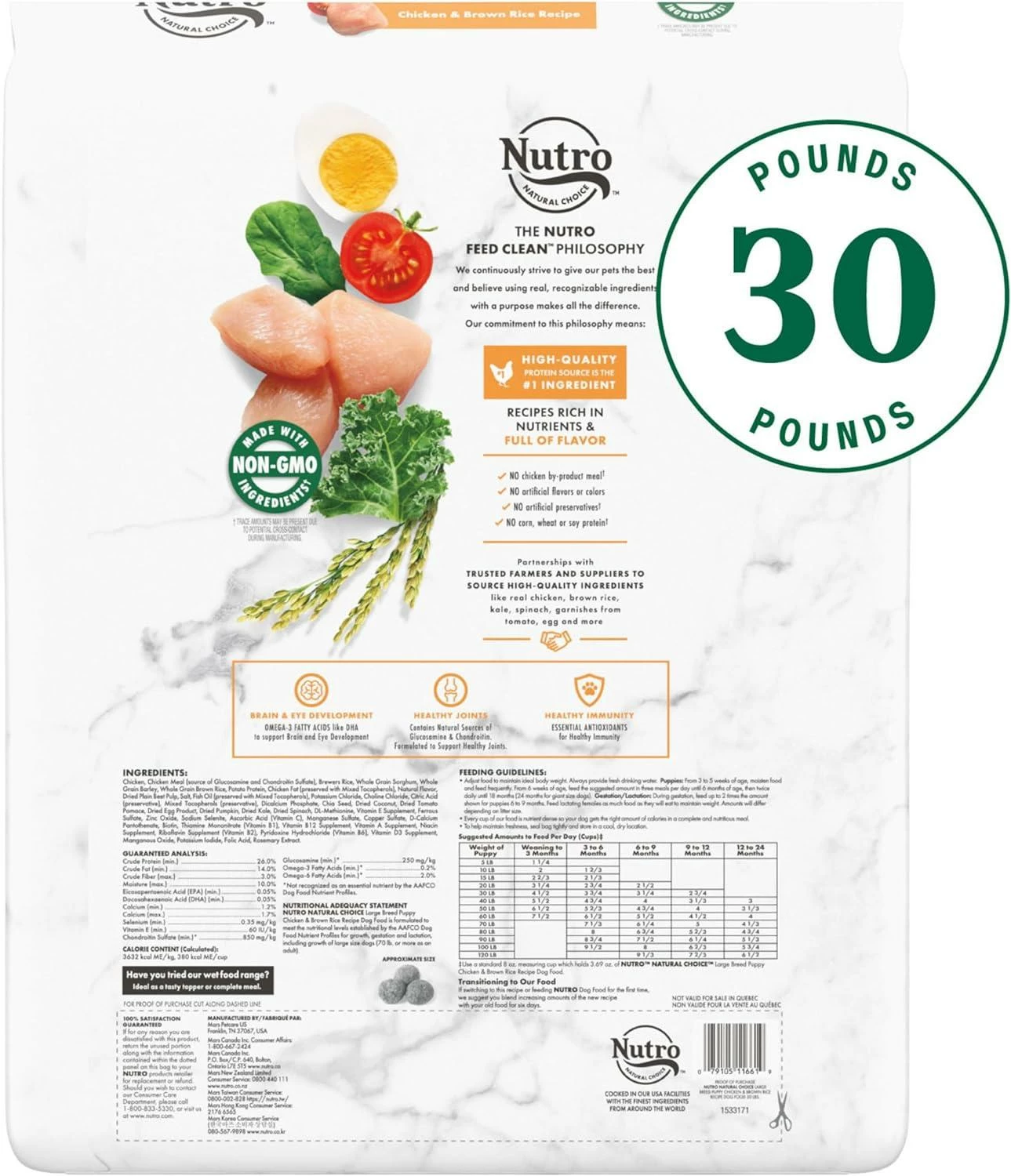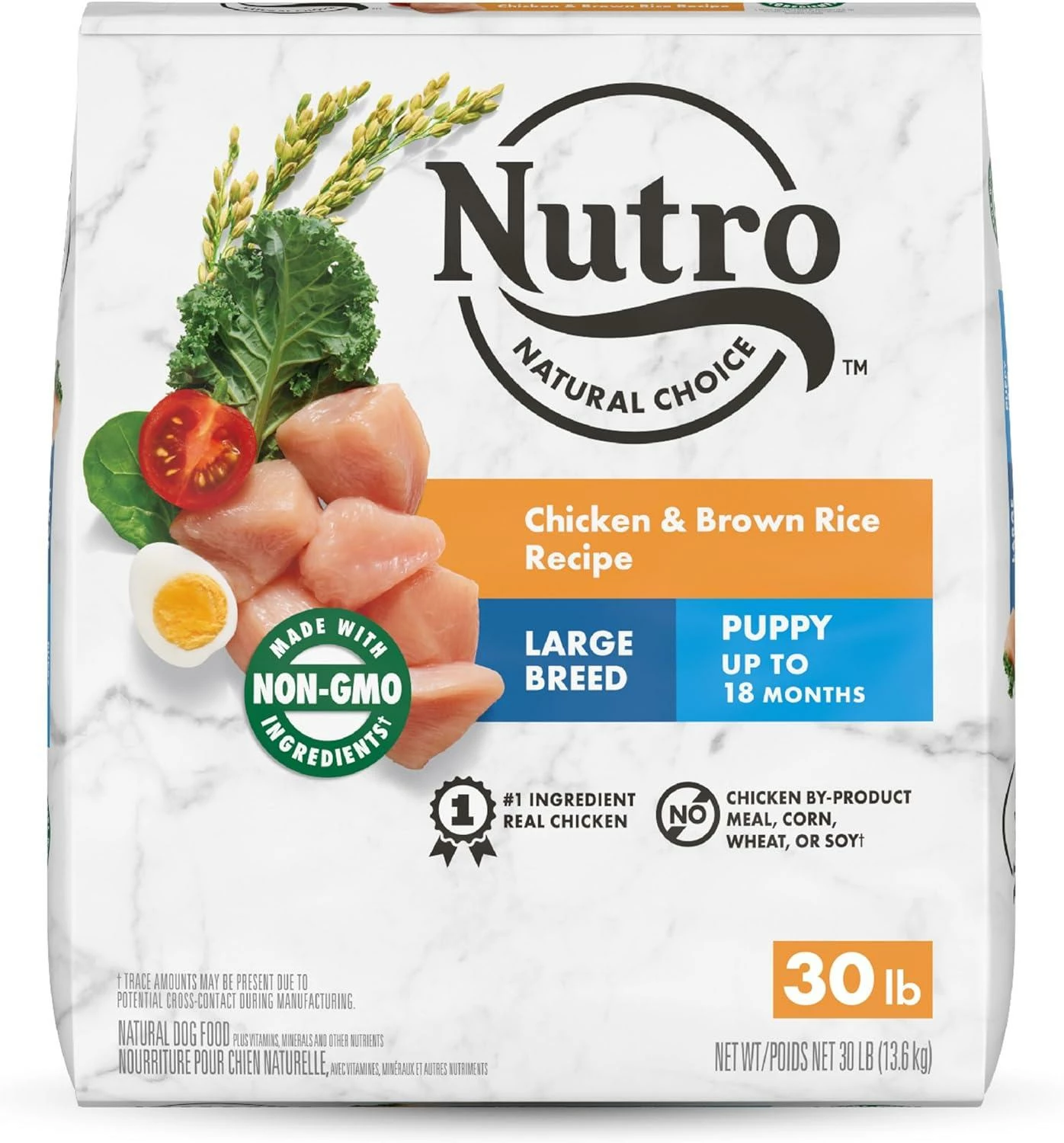 Give your pet the wholesome ingredients they love with NUTRO NATURAL CHOICE Dry Dog Food recipes. Made for large breed puppies up to 18 months old, this dry food supports brain and eye development with omega-3 fatty acids like DHA. Itβs formulated to support healthy joints, contains natural sources of glucosamine and chondroitin, and provides essential antioxidants for healthy immunity. As part of the NUTRO FEED CLEAN philosophy, this delicious chicken and brown rice recipe starts with a high-quality protein source as the 1st ingredient and is made with real, recognizable ingredients sourced from trusted farmers and suppliers. Plus, it’s made with non-GMO ingredients* and has no chicken by-product meal, corn, wheat, or soy*. So you can feel good feeding your dog recipes that are rich in nutrients and full of flavor. * Trace amounts may be present due to potential cross-contact during manufacturing.