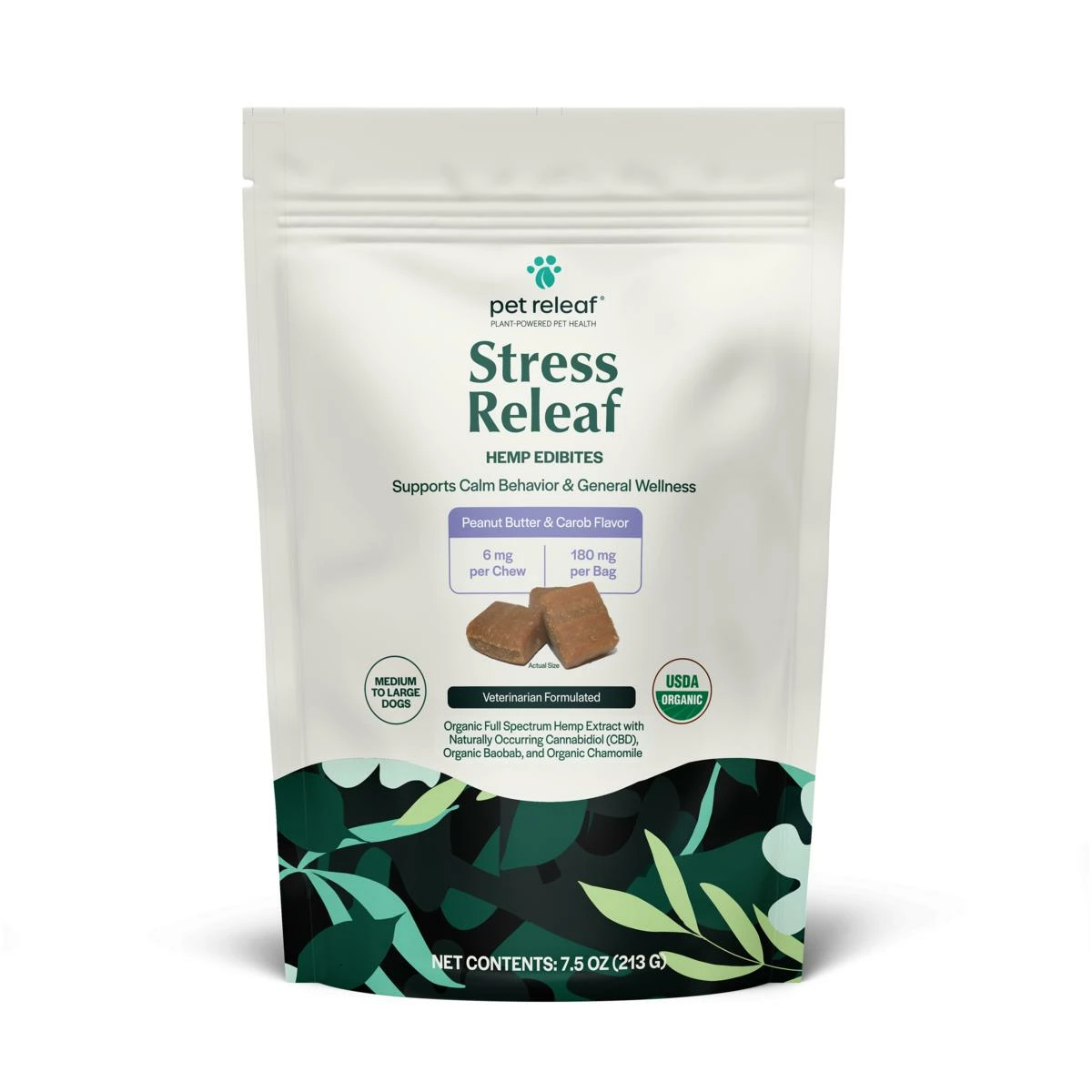 Pet Releaf’s Soft Chews for Dogs were created to support your dog’s overall wellness as well as specific health concerns. Along with hemp, our Stress Releaf Edibites for Medium or Large Breed Dogs were formulated with chamomile and baobab to further support their situational stress by promoting calming effects.