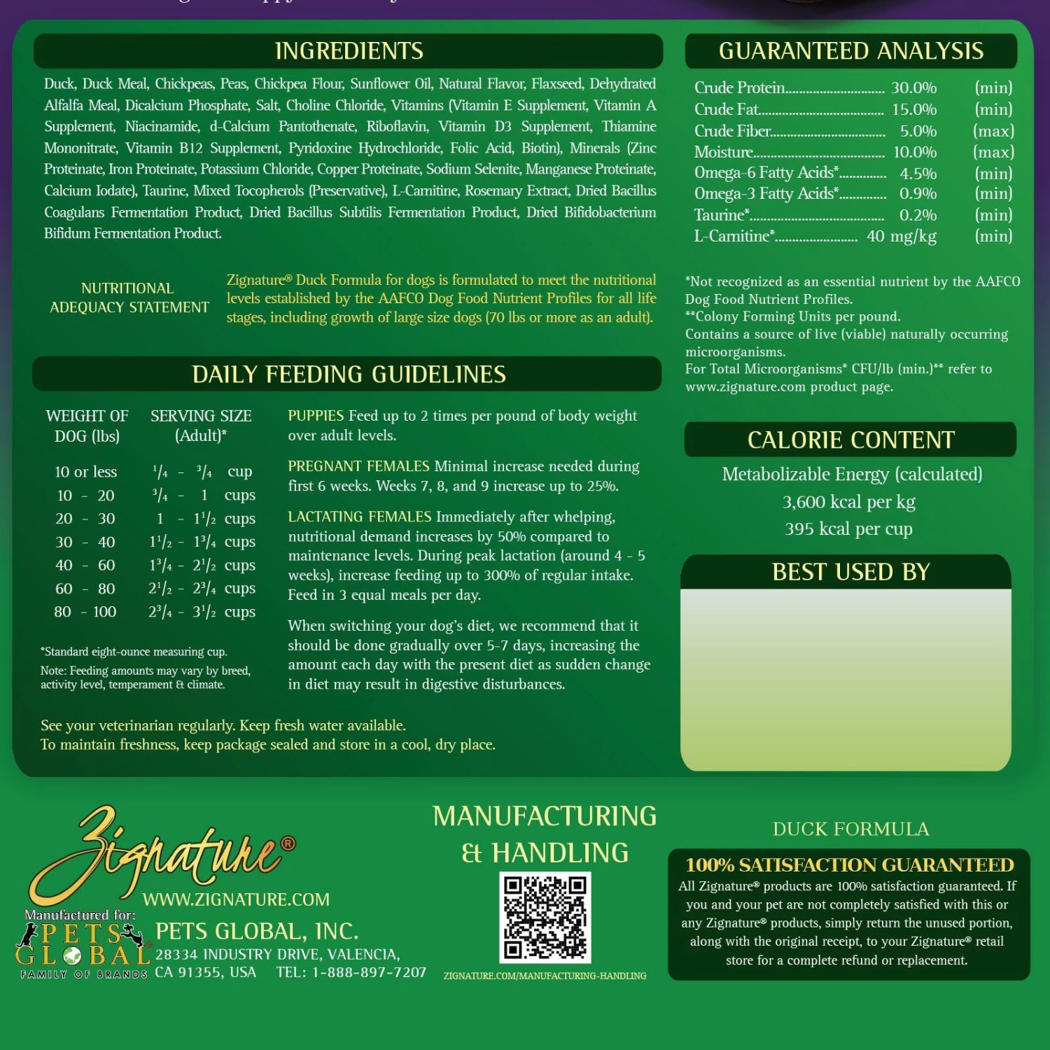 Duck, Duck Meal, Chickpeas, Pea Flour, Peas, Sunflower Oil (Preserved with Mixed Tocopherols and Citric Acid), Flaxseed, Dehydrated Alfalfa Meal, Natural Flavors, Potassium Chloride, Salt, Choline Chloride, Minerals (Zinc Proteinate, Iron Proteinate, Copper Proteinate, Manganese Proteinate, Cobalt Proteinate), Vitamins (Vitamin A Acetate, Vitamin D3 Supplement, Vitamin E Supplement, Niacin, D-Calcium Pantothenate, Thiamine Mononitrate, Pyridoxine Hydrochloride, Riboflavin Supplement, Folic Acid, Biotin, Vitamin B12 Supplement), Blueberries, Carrots, Cranberries, Minerals (Zinc Sulfate, Ferrous Sulfate, Zinc Oxide, Calcium Carbonate, Copper Sulfate, Sodium Selenite, Manganous Oxide, Calcium Iodate, Cobalt Carbonate). 425 kcal/cup